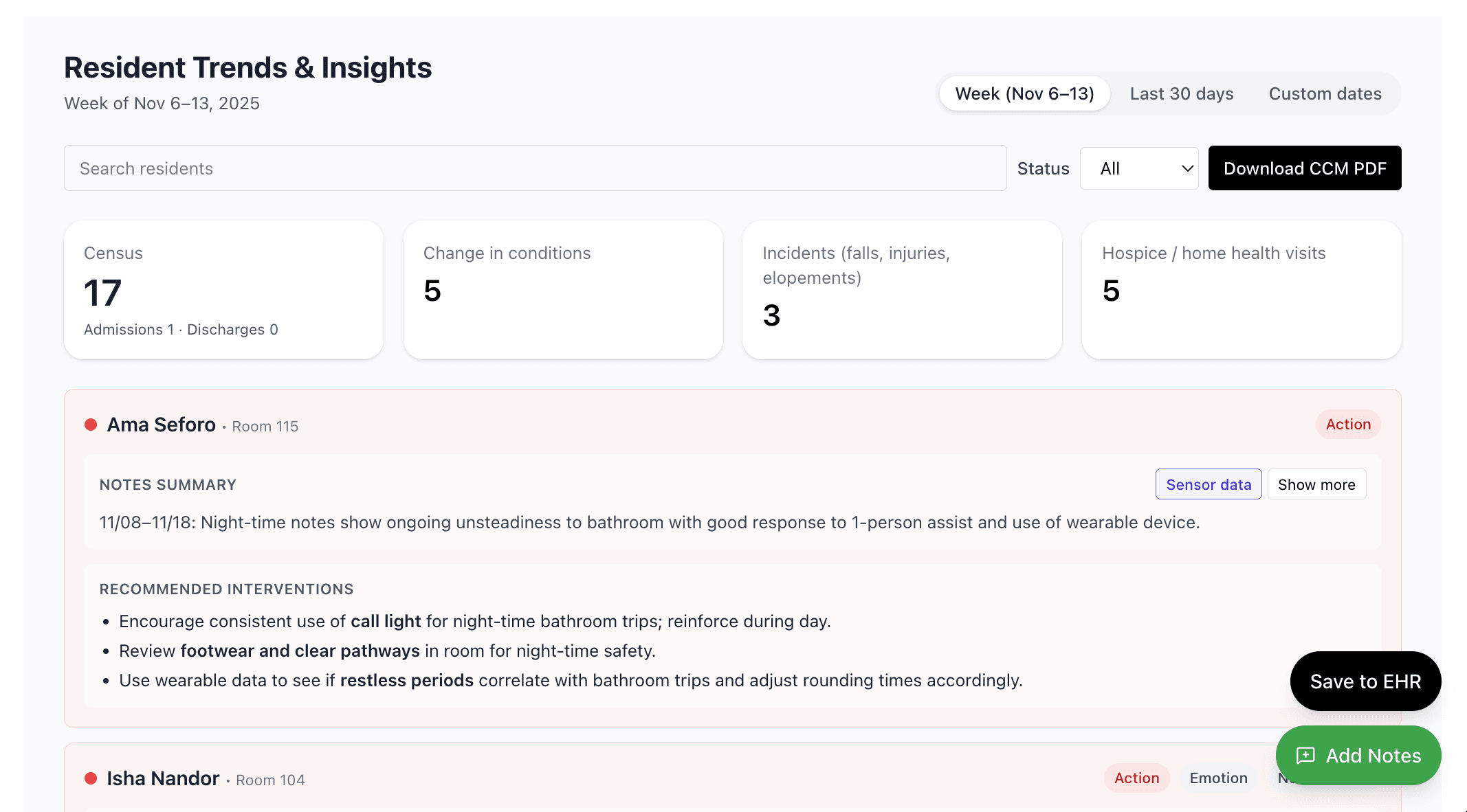 Automatically surface condition changes and emerging trends across residents and shifts—before issues escalate.